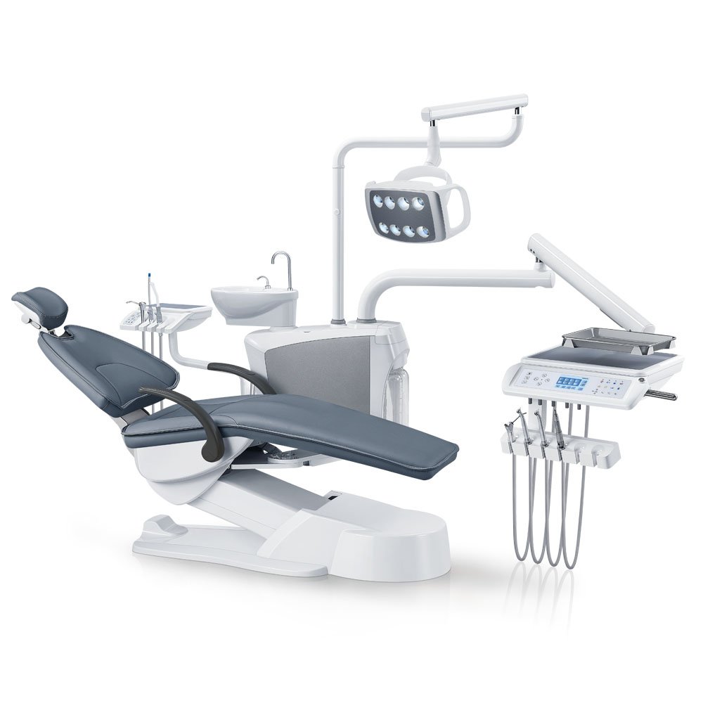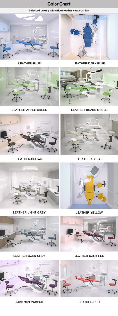 2.Luxury microfiber leather cushion, soft start and soft stop function, synchronized chair design, chair interlock system, spitting chair position, treatment chair position, emergency chair position, backrest anti-collision, Ti-motion motor, luxury multi-functional foot pedal.