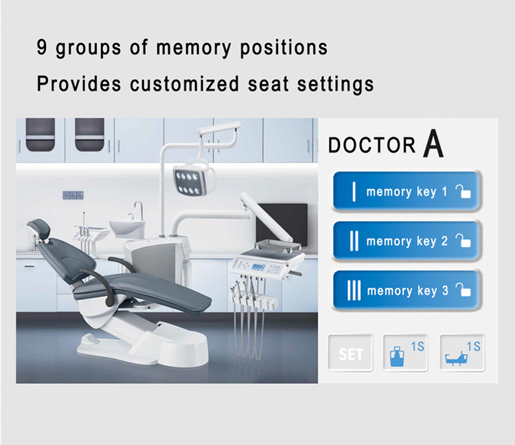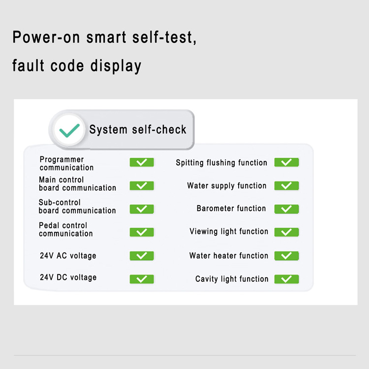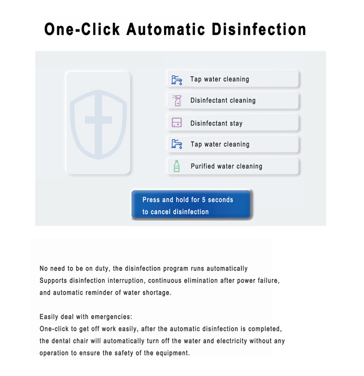 2,Easily deal with emergencies.one-click to get off work easily,after the automatic disinfection is completed,the dental chair will automatically turn off the water and electricity without any operation to ensure the safety of the equipment.